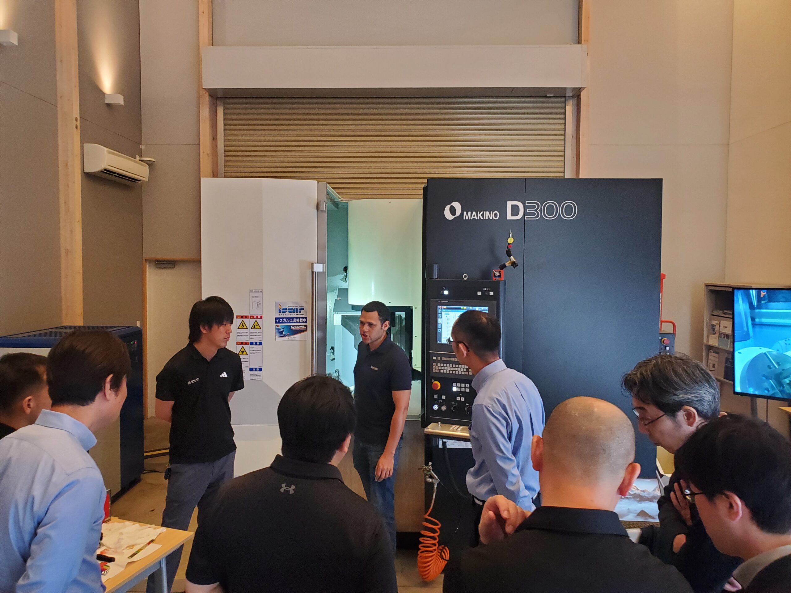 本社テクニカルセンターに常設しておりますMAKINO/D300実機を使用し、hyperMILL高精度モードのテストカットやhyperMILLと工作機械をネットワークで接続し、工作機械の制御装置と双方向のデータ通信を可能とするCONNECTED Machiningの実証試験等、最新機能の確認が行われました。